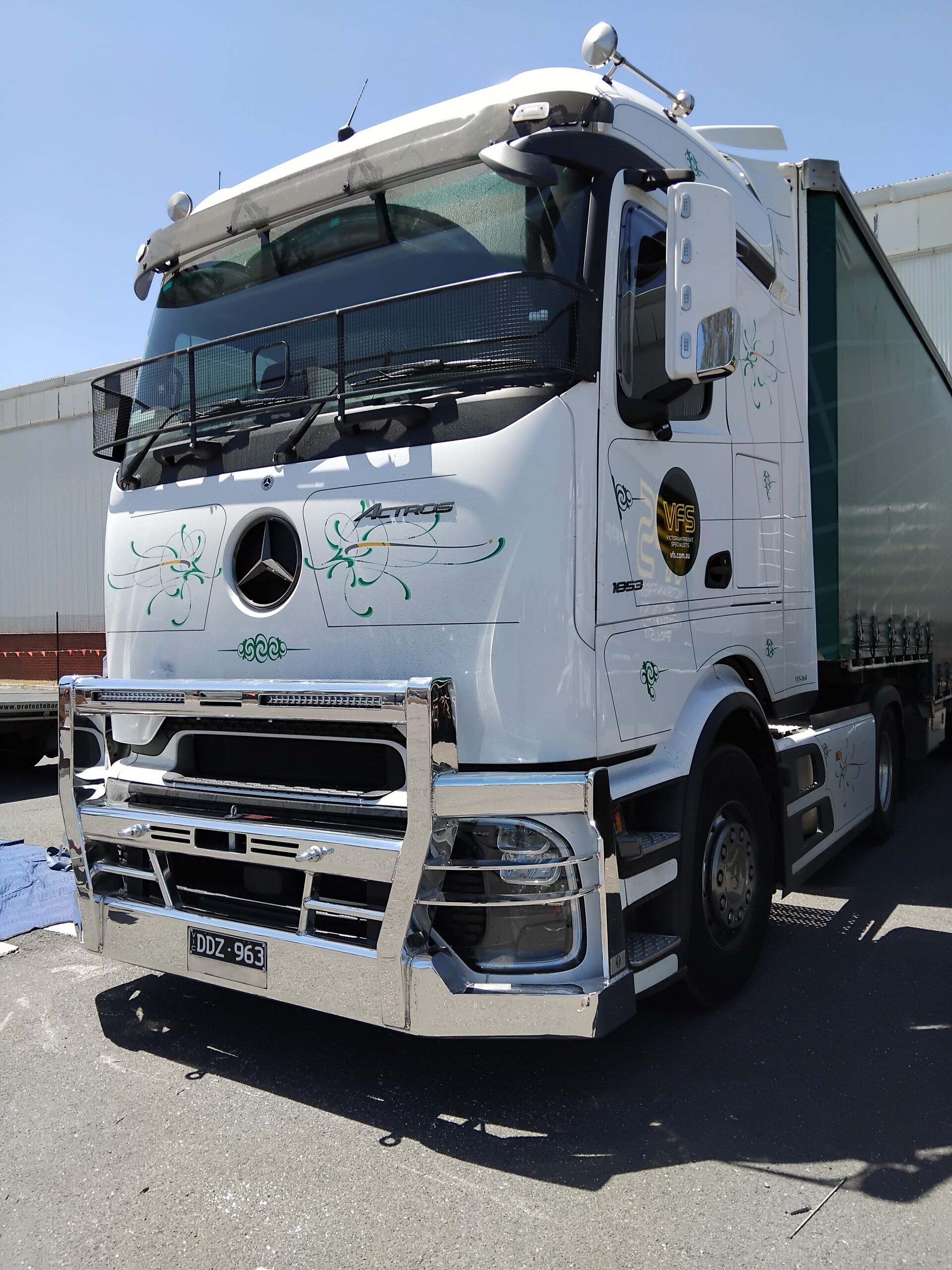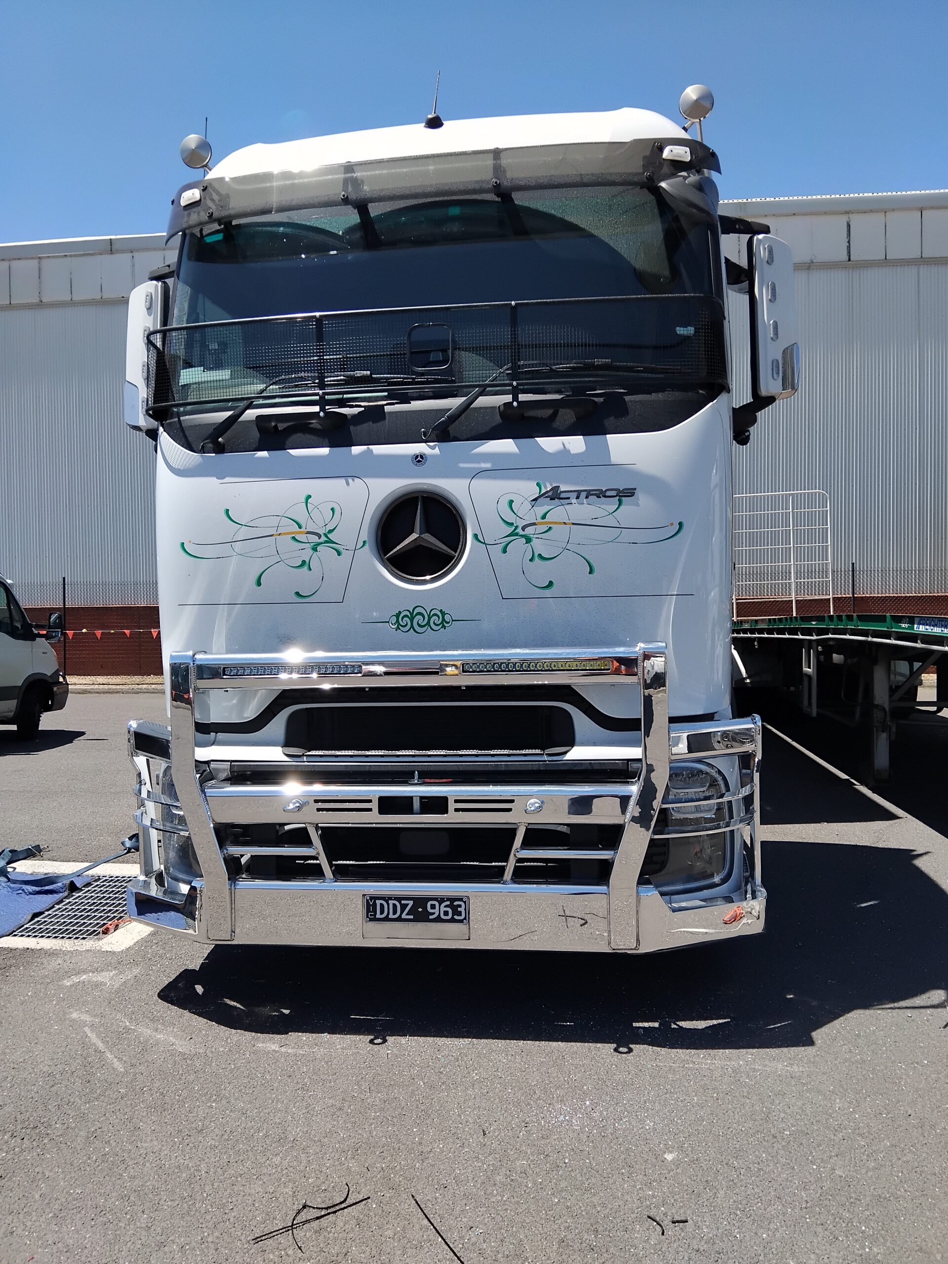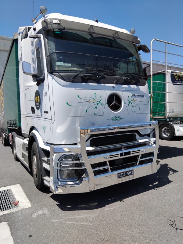 Engineered for the Mercedes Actros Pro-Cab, this Hi-Top bullbar delivers heavy-duty, made-to-order protection built for Australia’s harshest conditions. Constructed from premium materials and fully customizable—with options including mud flaps, swing plates and Roadtrain signage—it’s the ideal upgrade for operators who demand strength, reliability and a refined, truck-specific finish.