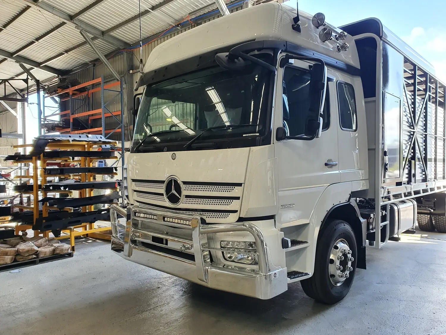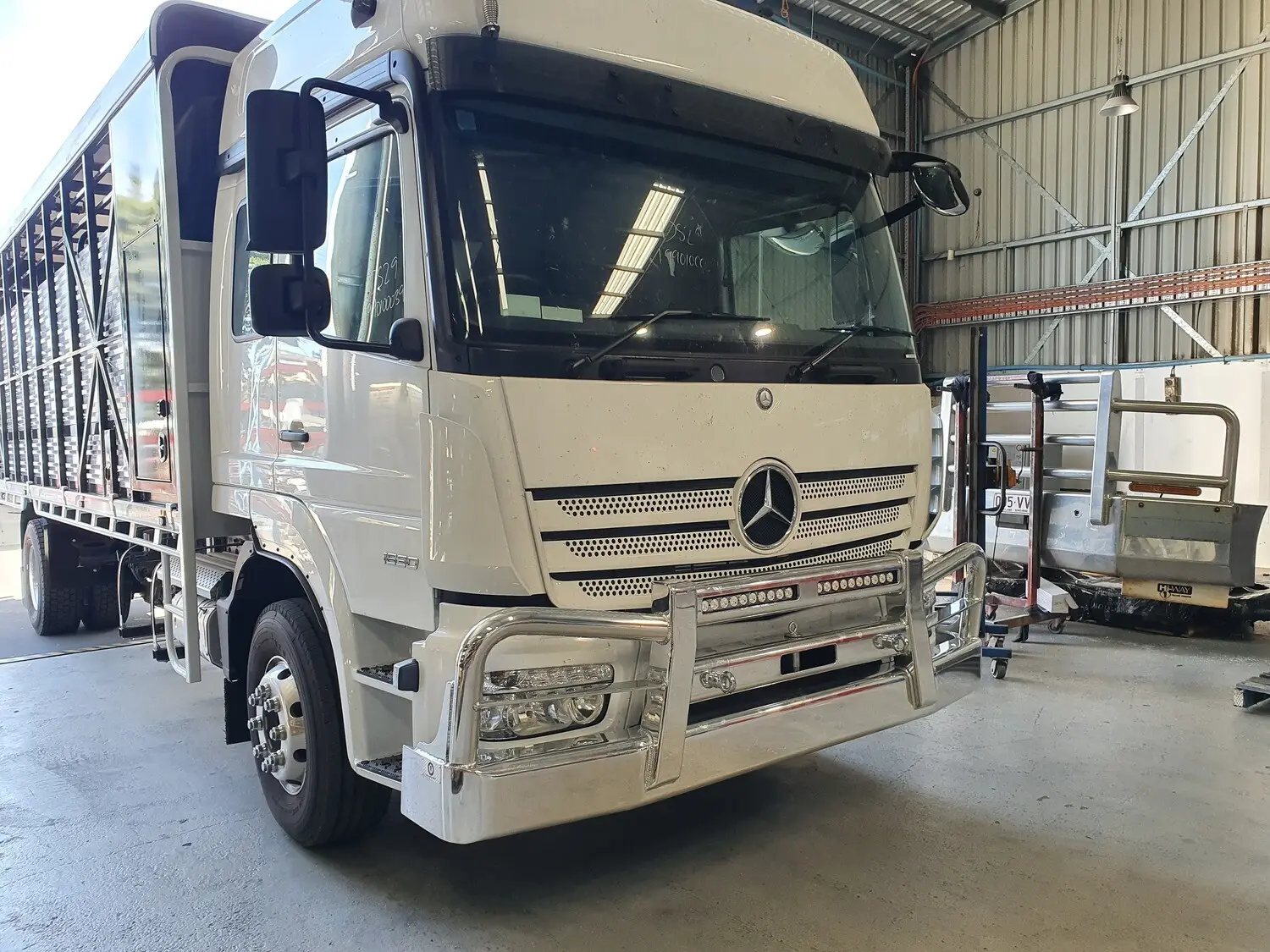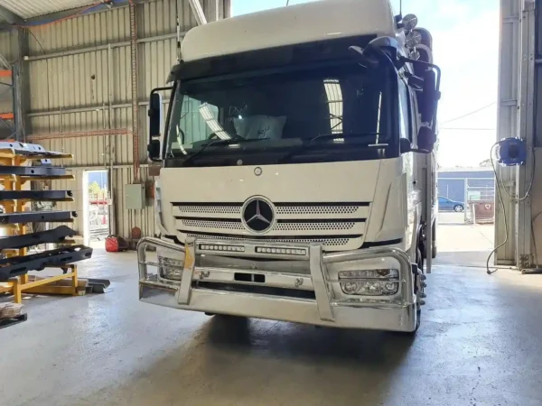 Rugged, versatile, and built for performance, the AJ’s Mercedes Atego Tube Outer Bullbar provides dependable protection for Australia’s challenging transport conditions. Its strong tubular design shields the front end while maintaining the Atego’s sleek, functional appearance. Proudly Australian-made from premium steel and alloy, the Tube Outer Bullbar can be customised with recessed LED light bars and tailored finishes to match your truck. Tough, durable, and ready for any job — the Atego Tube Outer Bullbar keeps your rig protected and looking sharp on every run.