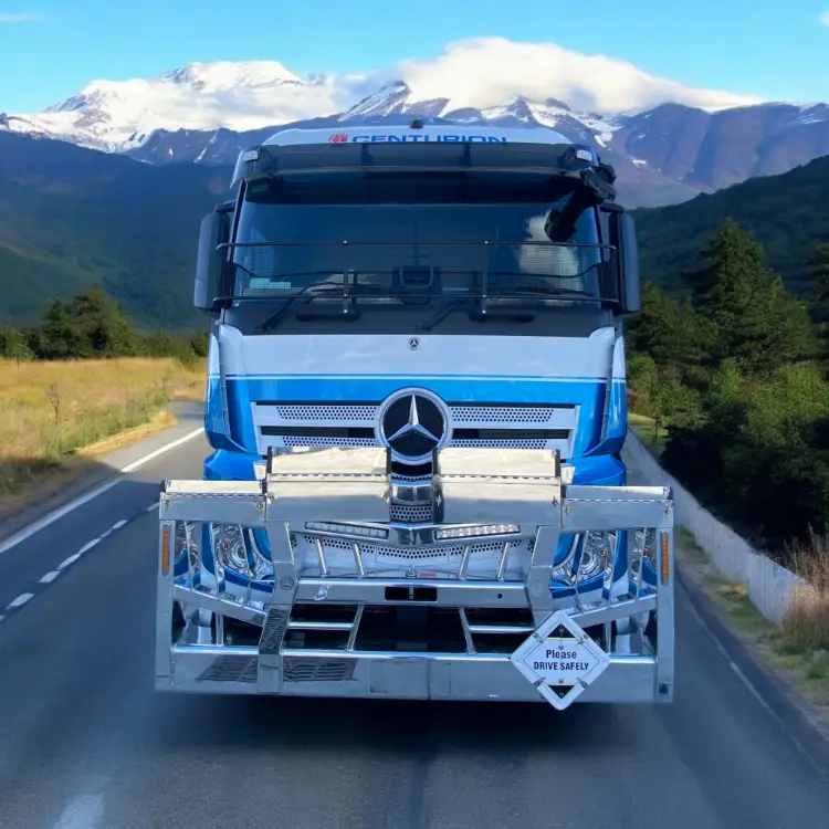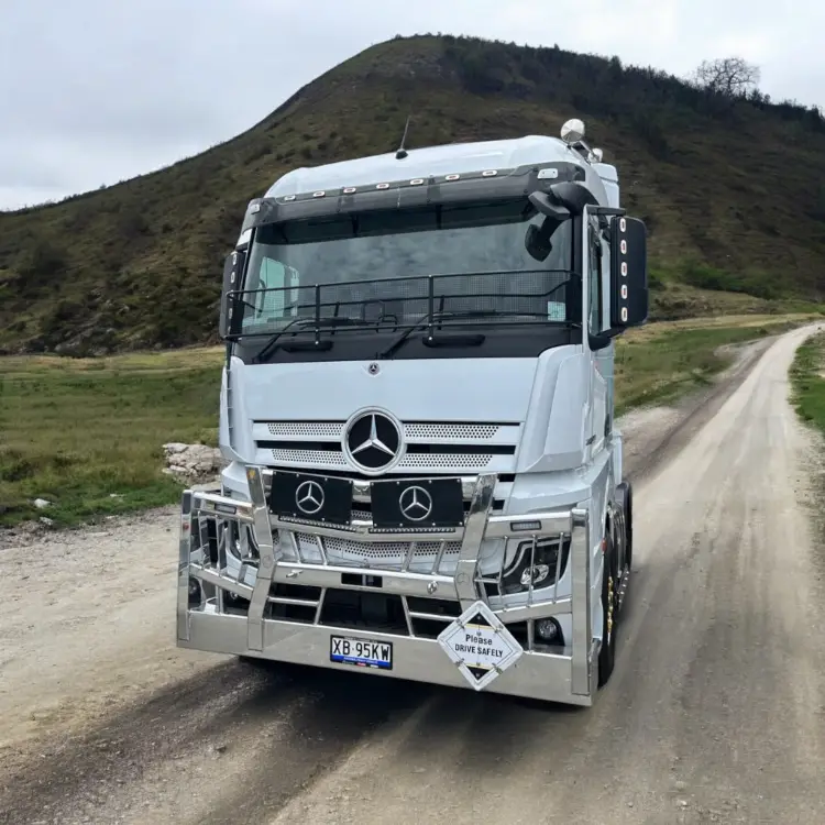 Designed for durability and built to perform, the AJ’s Mercedes Actros Fargo Bullbar offers unbeatable strength, safety, and style for Australian road conditions. Featuring a robust FUPS-compatible four-post design, the Fargo provides superior front-end protection while enhancing the Actros’ bold and modern look. Proudly Australian-made from premium steel and alloy, it’s available with recessed LED light bars and custom finishes to match your truck’s setup. Reliable, tough, and built with precision — the Fargo Bullbar keeps your Actros protected and looking sharp on every job.