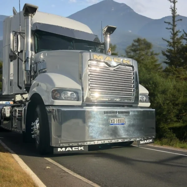 The Mack Superliner KingPin Bumper is engineered for elite performance and protection on Australia’s toughest roads. Built for heavy-duty applications—whether hauling road-trains or working in rugged environments—this premium bumper delivers exceptional front-end defense with style to match. Proudly manufactured in Australia, it features a rugged steel/alloy construction designed to withstand severe impacts, animal strikes and demanding conditions. Optional recessed 100-watt LED light bars offer superior night-time visibility, while custom finishes (polished or powder-coated), centers supports, signage and auxiliary lighting mounts let you tailor the set-up to your exact needs. Built to meet Australian safety and durability standards, the KingPin Bumper blends uncompromising protection with refined design—ensuring your Mack Superliner is ready for the toughest jobs ahead.