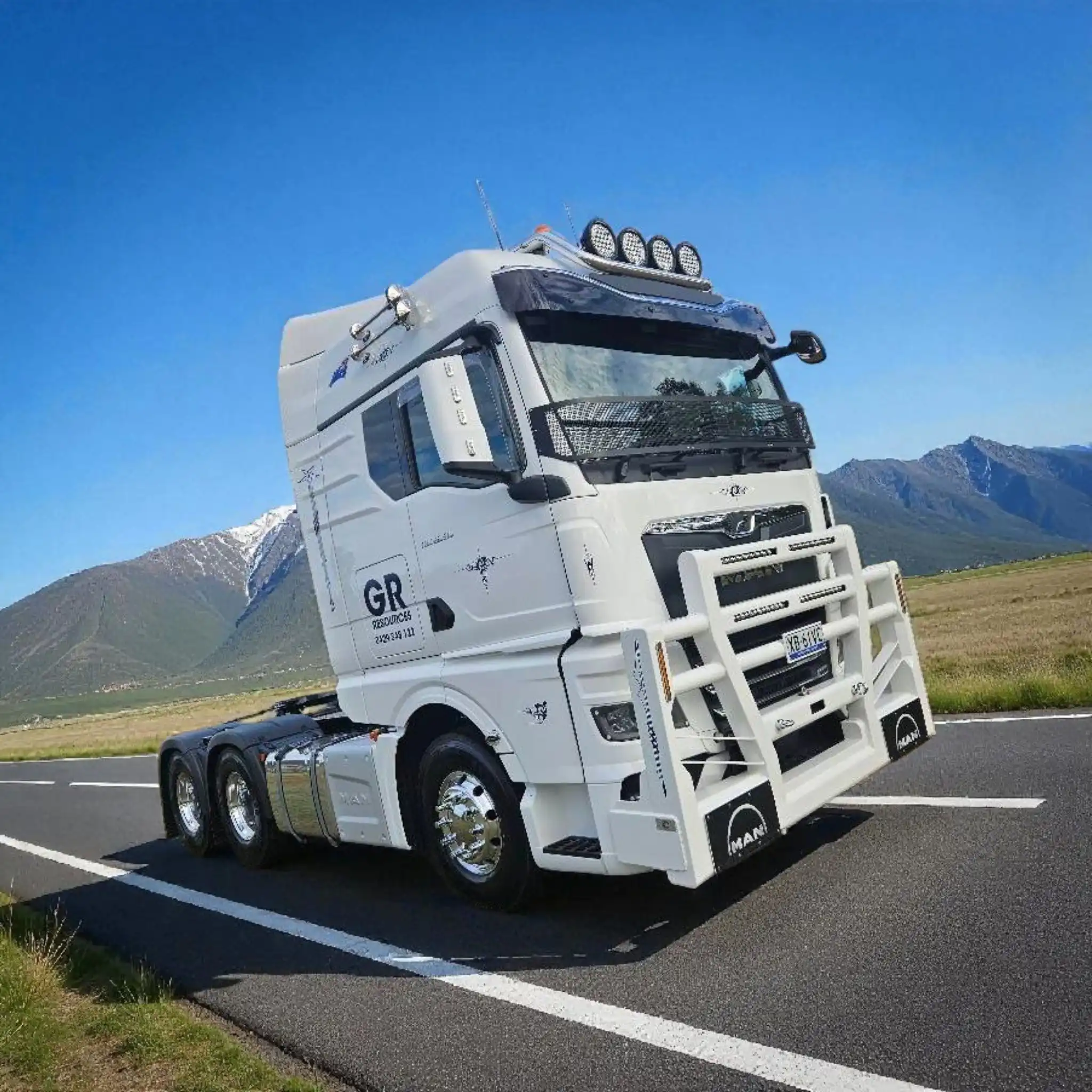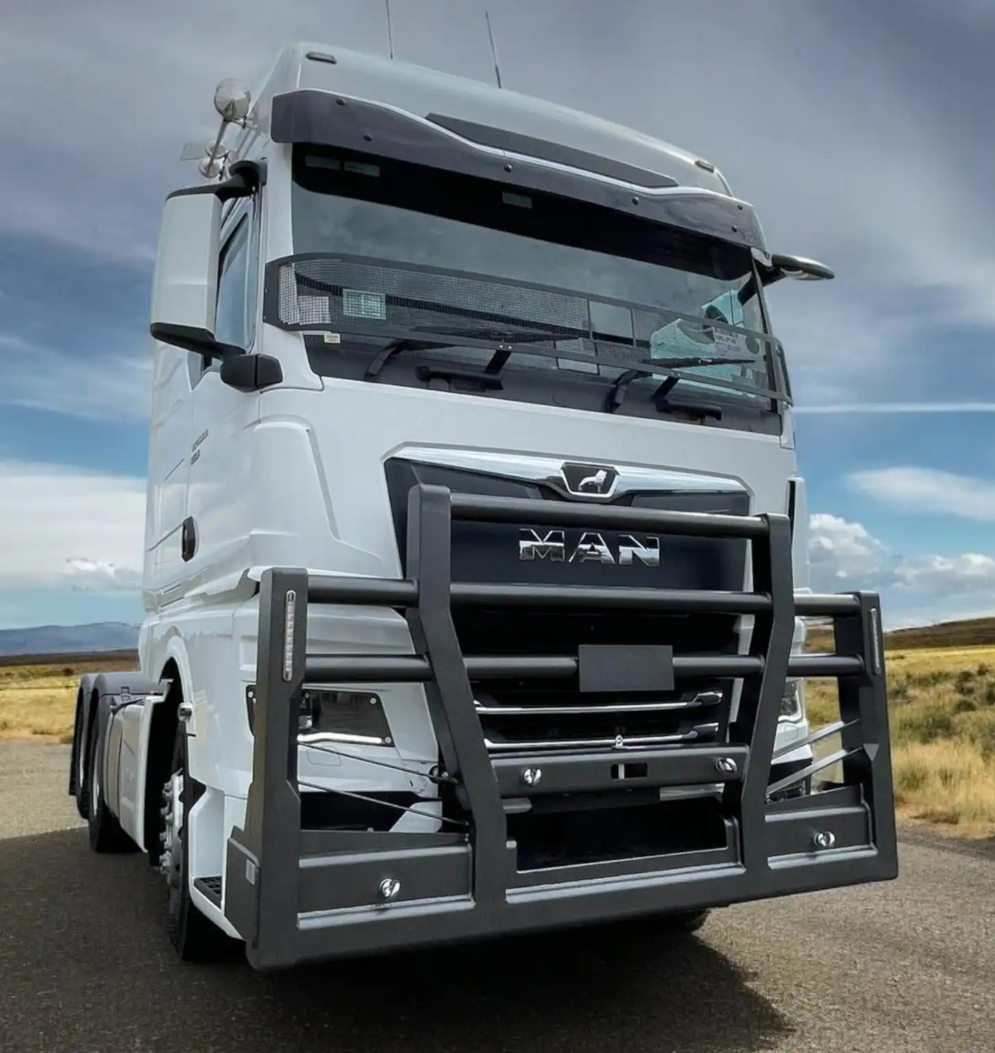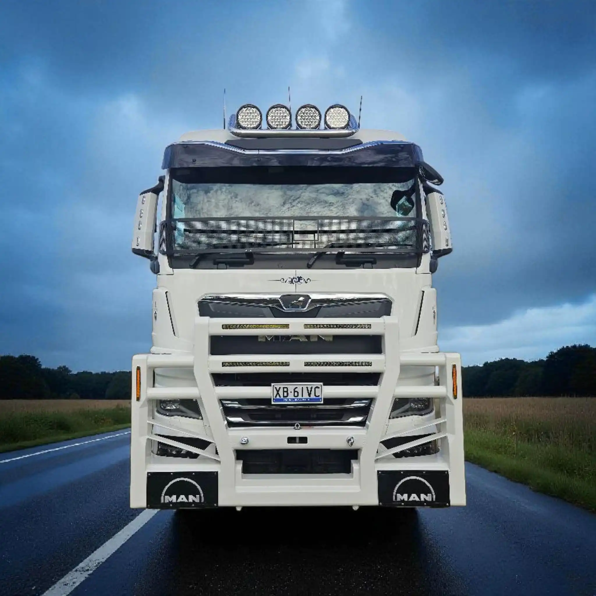 Powerful, rugged, and built for extreme conditions, the AJ’s MAN Road Train Heavy Duty Bullbar delivers unmatched strength and protection for Australia’s toughest routes. Designed for serious road train and long-haul operations, it provides maximum front-end defence while enhancing the MAN’s bold and commanding appearance. Proudly Australian-made from premium heavy-duty steel and alloy, this bullbar can be fitted with recessed LED light bars and customised finishes to suit your setup. Tough, reliable, and built to go the distance — the MAN Road Train Heavy Duty Bullbar keeps your truck protected and performing at its best, no matter how demanding the job.
